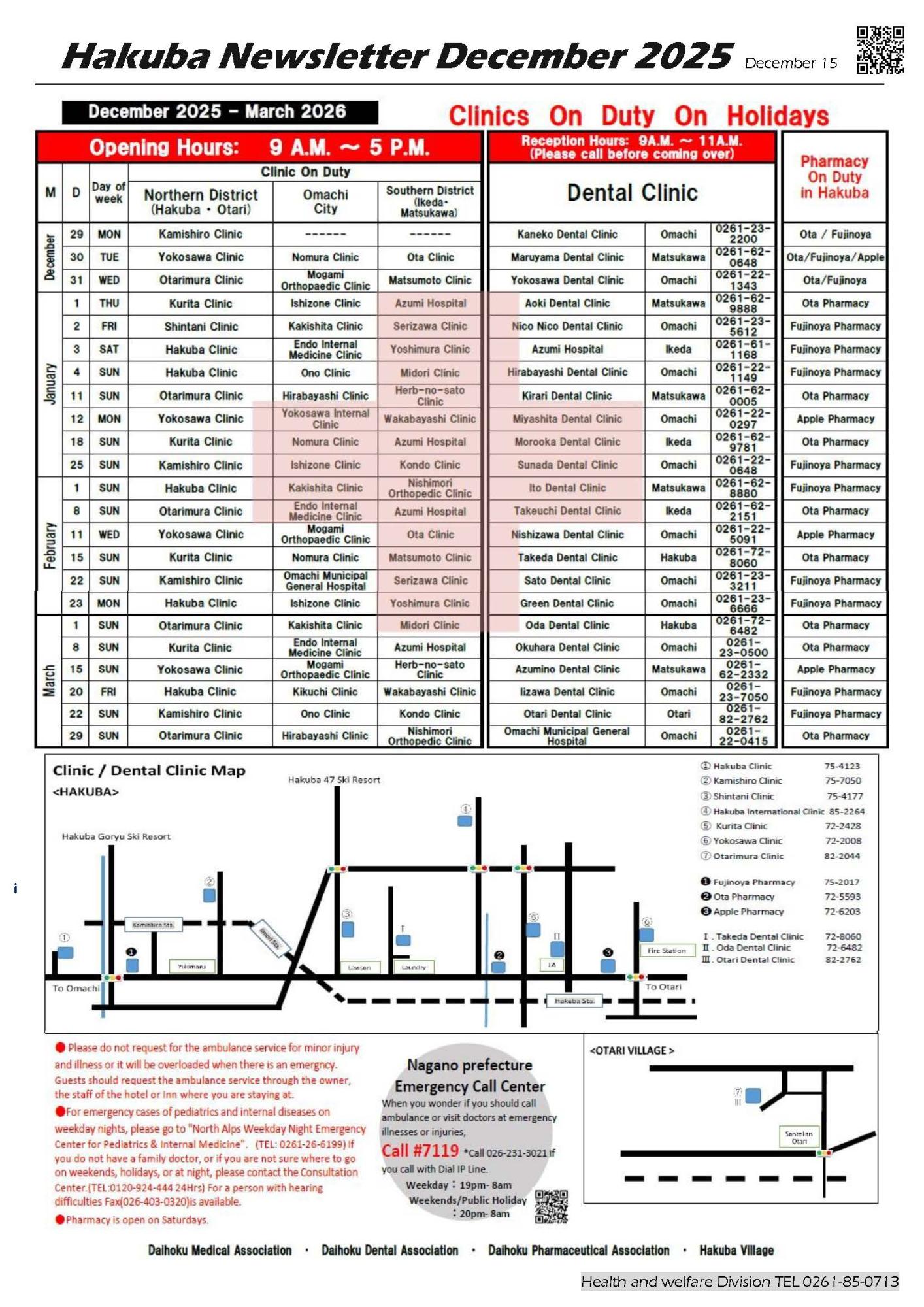 Hakuba Village - Hakuba Newsletter Current Issue Hakuba_Newsletter_Dec_2025 (PDFファイル: 2.1MB) Back Number Hakuba Village - Hakuba Newsletter Back Number この記事に関するお問い合わせ先 総務課 情報まちづくり係〒399-9393長野県北安曇郡白馬村大字北城7025電話番号:0261-72-7002 ファックス:0261-72-7001お問い合わせはこちら Tweet 更新日:2025年12月16日