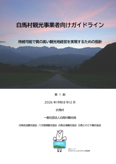 本ガイドラインは、魅力的な観光地域づくりを推進するために、地域の観光事業者が共通して取り組むべき義務や推奨事項を明らかにし、持続可能で質の高い観光地経営を実現するための指針として定めるもので、白馬村観光局、村内常設観光協会及び白馬村が協働して策定しました。
