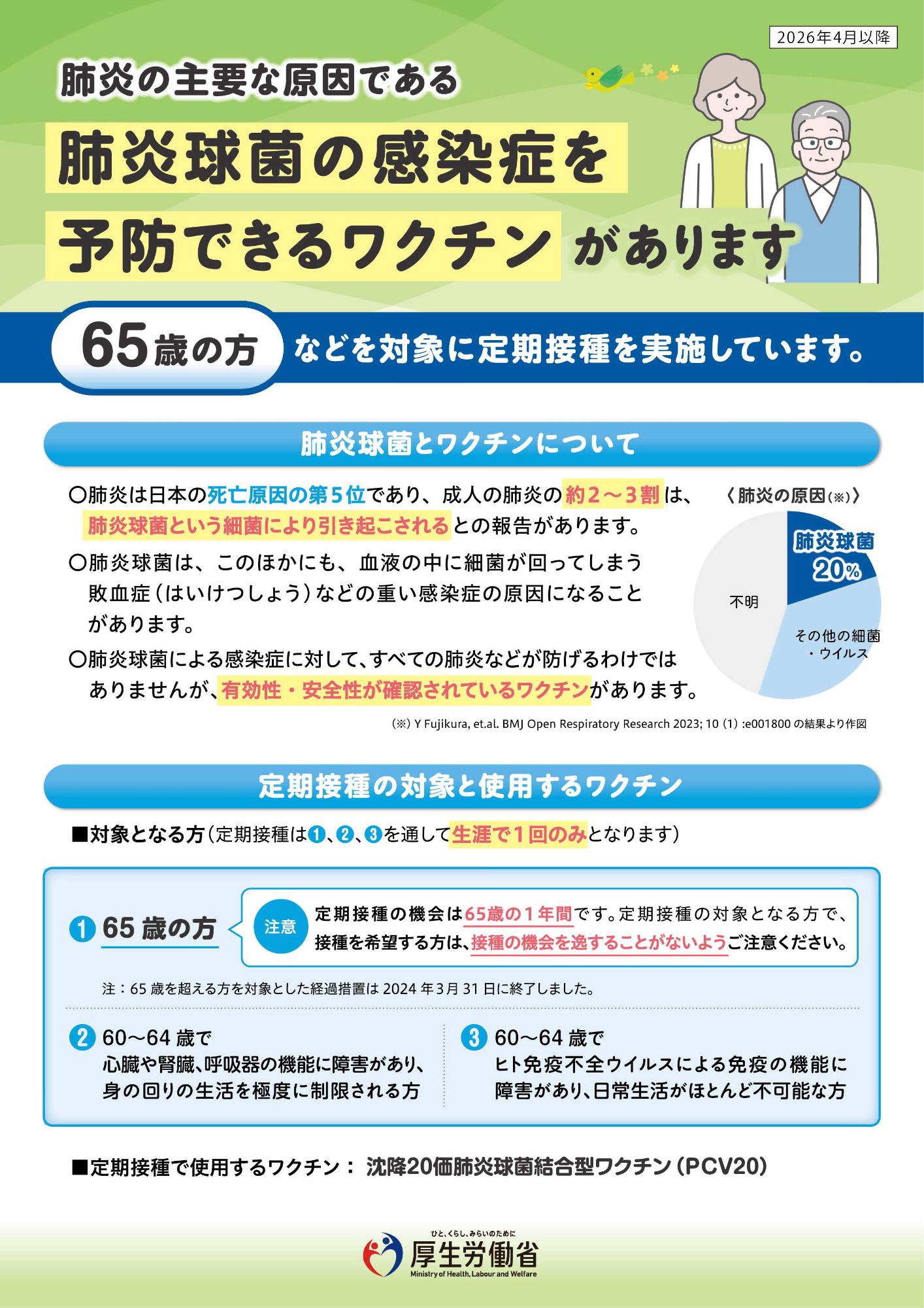 肺炎で一番多い病原菌は肺炎球菌です。肺炎球菌ワクチンを接種しておくと、肺炎の予防や肺炎にかかっても軽い症状ですむ効果が期待されます。