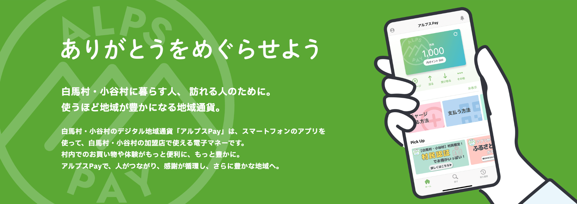 地域通貨「アルプスPay」 白馬村と小谷村では、スマートフォンのアプリケーションに現金をチャージして、地域の加盟店で利用できる地域通貨「アルプスPay」の運用を令和7年11月17日(月曜日)から開始しました。 地域通貨は、村民や事業者の皆さんのアイデア次第で、様々なメリットが考えられます。 キャッシュレス決済の推進による決済事務の効率化 地域内経済循環の促進による地域経済の活性化 限定クーポンやポイント還元等による村民割引制度 ふるさと納税の返礼品として地域で使えるポイントを提供 ボランティアやイベントの参加者にポイントを付与 など お得に楽しく活用する方法をみんなで考えましょう! アルプスPay 特設サイト アルプスPayの使い方 村民認証済ユーザーへのポイント付与 加盟店一覧 加盟店募集 アルプスPayふるさとポイント 利用者説明会 デジタル地域通貨の名称 この記事に関するお問い合わせ先 総務課 企画政策係〒399-9393長野県北安曇郡白馬村大字北城7025電話番号:0261-72-7002 ファックス:0261-72-7001お問い合わせはこちら 更新日:2025年06月02日
