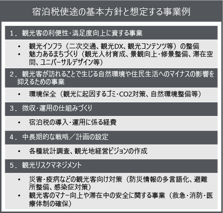 宿泊税を財源とする使途の基本方針と想定する事業例は下図のとおりです。具体的な事業は、観光地経営の基本理念と観光地経営ビジョン、使途の基本方針に基づき、白馬村観光地経営会議で審議します。