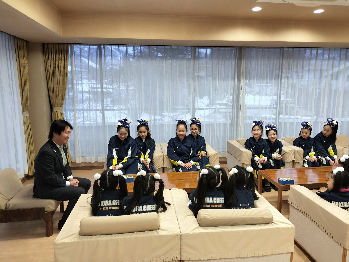 白馬チア「クリスタルレインディアーズ」が大会特別賞を村長に報告しました